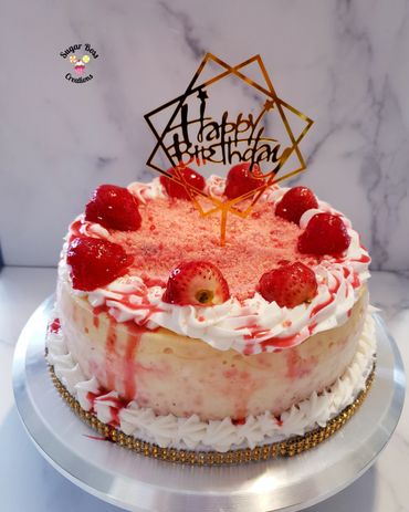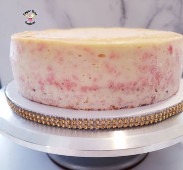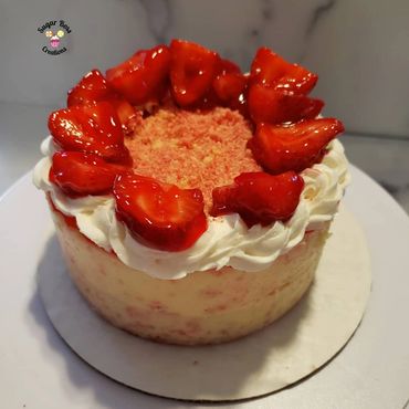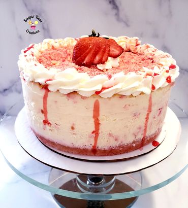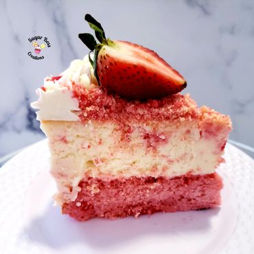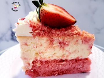A layer of delicious strawberry cake topped with cheesecake and strawberry crunch crumbs.