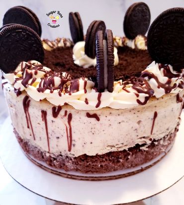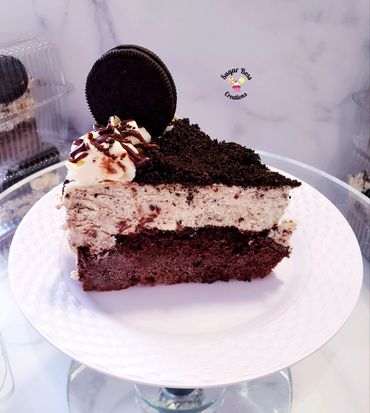 A layer of delicious chocolate cake topped with cheesecake and oreo crunch crumbs.
