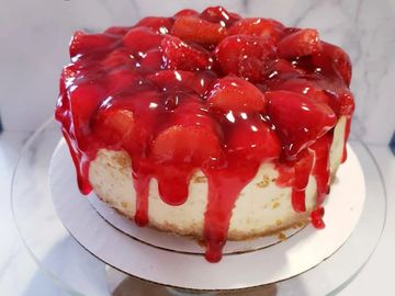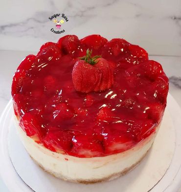 Creamy Cheesecake topped with glazed strawberries.