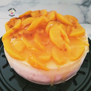 Creamy Cheesecake topped with delicious peach cobbler.