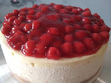 Creamy delicious cheesecake topped with cherries.