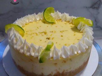 Creamy Cheesecake with key lime flavor topped with frosting and limes.