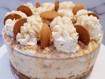 Creamy Cheesecake filled with sweet bananas topped with whip cream and caramel sauce.